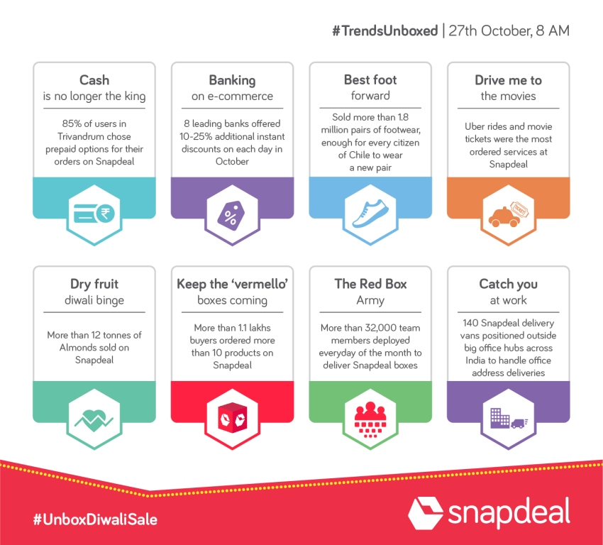 New Delhi, 27th October 2016: Snapdeal, India’s largest online marketplace, revealed interesting trends from its Unbox Diwali Sale, indicating a significant evolution in consumer behaviour this festive season.